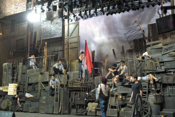 עצמון לוקח אותנו למסע על הבמה העמוקה, שגם מהקצה שלה אפשר לראות את האולם העמוס בכיסאות עד השורה האחרונה. עצמון עובר איתנו על כל הפרטים, ומציין כי "חייבות להיות פה העמקה ועבודת שטח רצינית, מהכיסאות ועד הבקבוקים, ואפילו התוויות שעל הבקבוקים, כי אתה לא רוצה ליפול בדברים הקטנים האלה אחרי שעשית מאמץ כזה גדול. אם אתה תולה על הקיר פוסטר שכתוב עליו משהו לא רלוונטי בצרפתית או לא קשור לתקופה, ברור שמישהו ישים לב לזה, וזה יכול לפגוע בכל האמינות שלך ולהרוס את כל מה שאתה עושה פה". עצמון מסתובב עם מחברת צמודה ועובר בין עשרות האנשים שעובדים על הבמה ומשתמשים בכל עומקה, אירוע לא שגרתי בתיאטרון הרפרטוארי הישראלי שמחפש בדרך כלל את הקטן יותר, מטעמי תקציב מובנים. "אבל את 'עלובי החיים' או שאתה עושה הכי גדול, או שאתה לא עושה", מסביר קפטן רגע לפני שמתחילה עוד חזרה.