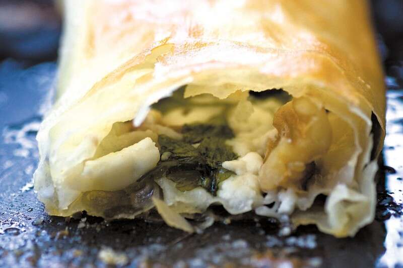 מחממים תנור ל־190 מעלות. מברישים את עלי הפילו בחמאה. מפוררים על חלקם התחתון את הגבינה - מחצית הכמות על כל עלה. מעל מפזרים את עשבי התבלין והאגוזים הקצוצים. מגלגלים לגליל, מברישים בחמאה ואופים במשך כ־1/4 שעה, כשתפר הקיפול כלפי מטה. מחממים את הדבש במיקרו או בסיר אדים כפול. כשהדבש הופך נוזלי, מוסיפים 2 טיפות מי ורדים. יוצקים מעל פני המאפה, זורים מעט מתערובת הזעתר ומגישים מייד.
