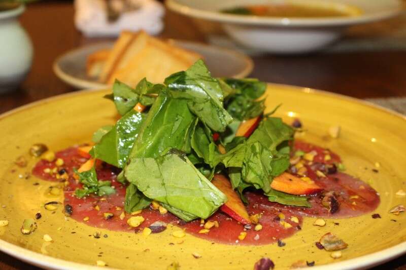 פתחנו את הארוחה בקרפצ'יו בקר (תוספת של 10 שקלים לעסקית) וגספאצ'ו עגבניות צהובות. הקרפצ'יו מגיע כנתחים עגולים ויפים של בשר דקיק בצבע נהדר, ועל גביו סלט תרד ירוק וקריספי עם נקטרינות ושברי פיסטוקים. הסלט לכשעצמו היה מצוין. שילוב נהדר בין התרד לפרי. אבל הקרפצ'יו, דרש קצת יותר התייחסות. זה הגיע עם טוסטים של לחם לבן. בסך הכל זו הייתה פתיחה נחמדה לארוחה. לגבי הגספאצ'ו, היו ציפיות והוא אכזב. גספאצ'ו מעגבניות צהובות, הכלול במחיר העיקרית, דורש עגבניות משובחות במיוחד. במקרה הזה טעם העגבניות לא היה מספיק חזק, ובצדק תמכו בו בתבלינים כדי לחזק את הטעם. אבל זה לא עזר. העגבניות היו מימיות מדי, וגם לא נטחנו לנוזל חלק ומאוחד. גם פלפלים, בצל ועירית קצוצים לא עזרו במקרה הזה.