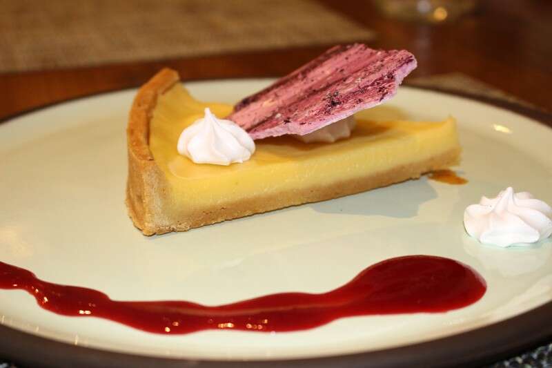 אם חשבתם שכאן הסתיימה הארוחה, אז טעיתם. הגענו לחלק הטוב ביותר שלה. טארט לימון נפלא (44 שקלים) שכל כך מתאים לקליפורניה. הטארט מגיע בליווי קולי פטל ומרנג סיגליות מרהיב. זהו פאי לימון אחד מהטובים שטעמנו לאחרונה. איזון מדויק בין חמוץ למתוק, יציבות נהדרת של העוגה ותוספות יפהפיות וטעימות מסביב.