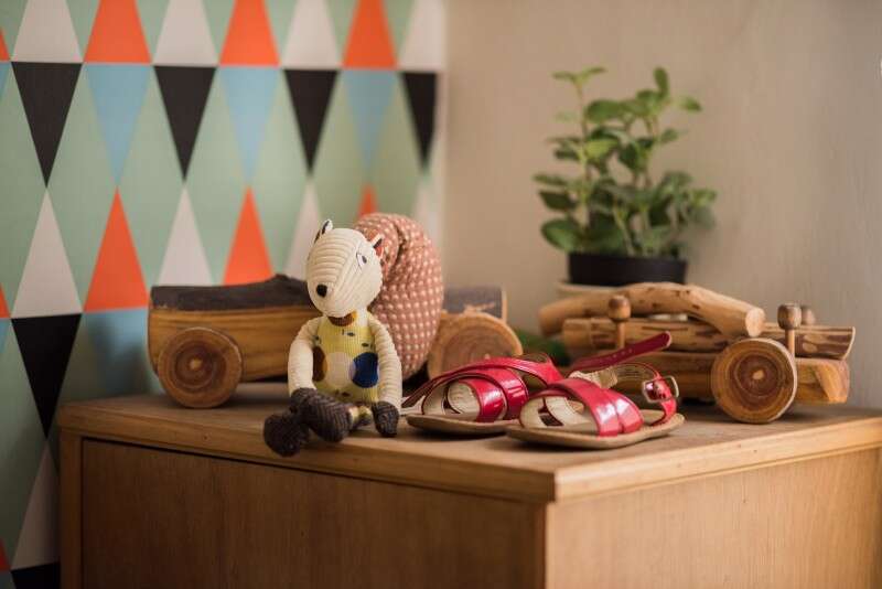 חדר הילדים צר וארוך, ובו מיטת קומתיים מעץ ומיטת ברזל במידות זעירות יחסית. נוכחותו של הטפט הגאומטרי הדומיננטי מפתיעה דווקא בשקט שהוא יוצר בתוך החדר וכמו מלכד את כל הפריטים לתמונה אחת הרמונית, יחד עם השטיח הסרוג בעבודת יד, עם הווילונות הבהירים ועם שרשראות הדגלים העשויות בד. שפע החומרים והרעיונות מעידים על האהבה הגדולה שהושקעה בחדר הזה, על הרצון להעניק סביבה מטופחת ומטופלת לשלושת דייריו, ותחושת קן מרפדת וזיכרונות ילדות נפלאים.