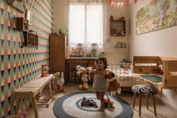 חדר הילדים צר וארוך, ובו מיטת קומתיים מעץ ומיטת ברזל במידות זעירות יחסית. נוכחותו של הטפט הגאומטרי הדומיננטי מפתיעה דווקא בשקט שהוא יוצר בתוך החדר וכמו מלכד את כל הפריטים לתמונה אחת הרמונית, יחד עם השטיח הסרוג בעבודת יד, עם הווילונות הבהירים ועם שרשראות הדגלים העשויות בד. שפע החומרים והרעיונות מעידים על האהבה הגדולה שהושקעה בחדר הזה, על הרצון להעניק סביבה מטופחת ומטופלת לשלושת דייריו, ותחושת קן מרפדת וזיכרונות ילדות נפלאים.