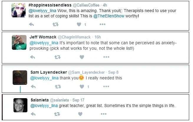 אלינה הוצפה בתגובות בטוויטר, כאשר חלק גדול מהגולשים הגיבו בשמחה, וטענו כי יישמו את העצות – ואילו אחרים טענו שרשימה זו עשויה להוסיף לחצים, וכי כל אדם צריך לבחור באילו נקודות להתמקד ולאו דווקא לקיים את כלל הרשימה.