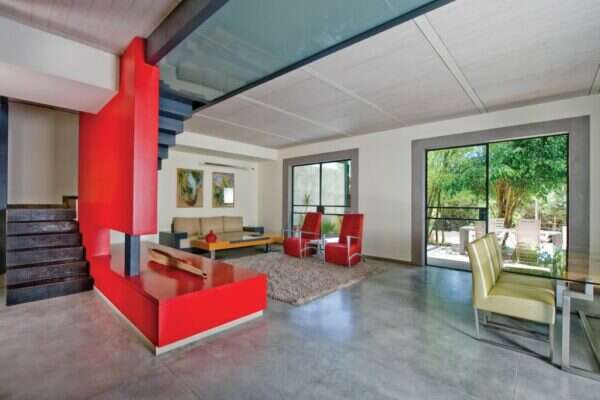 הסלון של המעצב יפרח בן צבי קיר אדום שמתחבר לרהיט // צילום: יח"צ