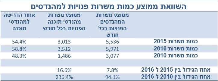 בנוסף לעלייה התלולה בשכר המהנדסים, כמות המשרות הפתוחות בתחום צמחה אף היא בעשרות אחוזים. על פי הסקר, חודש אוגוסט 2016 היה החודש עם כמות המשרות הפתוחות הגבוה ביותר למהנדסים בשש השנים האחרונות, עם כ-6,825 משרות פתוחות למהנדסים. הביקוש למהנדסים מהווה כ-6.6% מכלל המשרות הפתוחות במשק הישראלי.