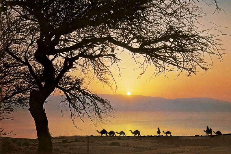 צילומי זריחות רומנטיות היו אהובים על הקהל במשך כל השנים. את אחת התמונות היפות והנדירות צילם חנן דורפצאון בשנת 1952, במהלך טיול לאזור ים המלח ועין גדי, שעדיין לא היה מתויר במיוחד. "טיילנו במדבר יהודה בדרך לא דרך וחטפנו כמה פנצ'רים בג'יפ. הצילום נעשה במצלמת 'הסלבלט', שהיתה נדירה באותם ימים. חיפשתי מבעוד יום את העץ המתאים, בתקווה שזווית הזריחה תתלבש על צללית העץ. שיירת הגמלים הגיעה מצילום אחר, מה שנקרא אז טכניקת סנדוויץ'. באותם ימים לא היה פוטושופ". (צילום: חנן דורפצאון)