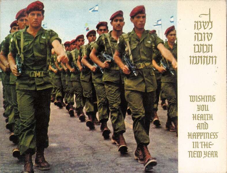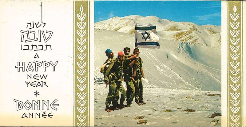 ב־12 ביוני 1967, עם סיומה של מלחמת ששת הימים, הונחתו כוחות מחטיבת גולני על פיסגת החרמון וכבשו את ההר ללא קרב. מאז קיבל ההר הגבוה בישראל את הכינוי "העיניים של המדינה", ולא היה אפשר שלא להדפיס גלוית שנה טובה המתעדת את חיילי צה"ל הראשונים על ההר. את הגלויה צילם הביולוג ד"ר עוזי פז, המנהל הראשון של רשות שמורות הטבע. (צילום: עוזי פז)
