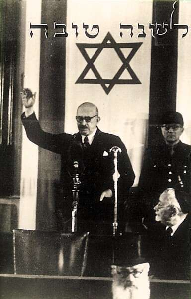 ב־17 בפברואר 1949, שמונה חודשים אחרי הכרזת העצמאות, הושבע חיים ויצמן לנשיא הראשון של מדינת ישראל. עד אז כיהן ויצמן כנשיא מועצת המדינה הזמנית. טקס ההשבעה התקיים בבית הסוכנות היהודית בירושלים, כחלק מישיבתה השישית של מליאת הכנסת הראשונה. גלוית ה"שנה טובה" המתעדת את הטקס היתה מהמוצלחות שיצרה חברת פלפוט אי פעם ונמכרה במאות אלפי עותקים בארץ ובחו"ל.
