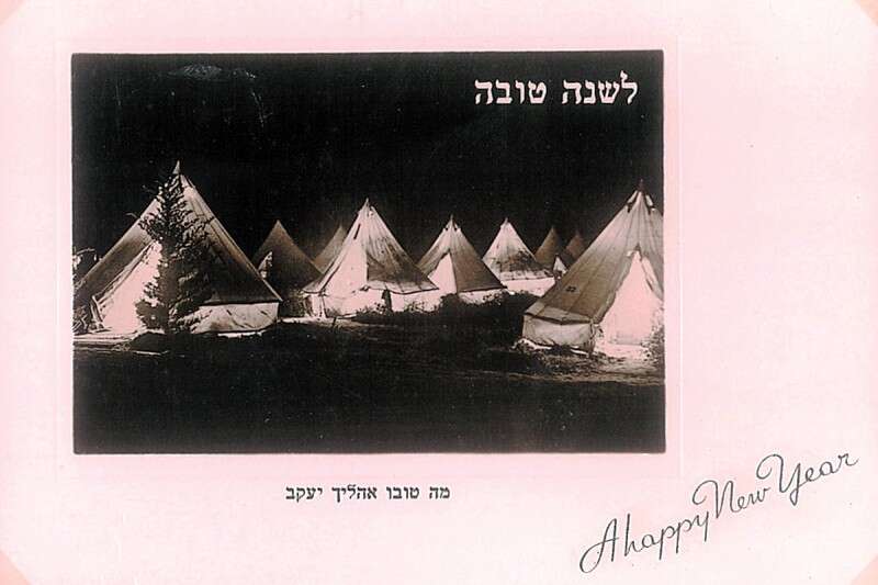 התמונה שבגלויה צולמה בשנת 1952 על ידי יהודה דורפצאון במעברה במרכז הארץ. נראים בה אוהלים "דה לוקס", שבהם היו חשמל ותאורה, ולצידה הופיע הציטוט התנ"כי "מה טובו אהליך יעקב". מטרת הגלויה היתה לפאר את מפעל העלייה האדיר, אלא שמצבם של מאות האלפים שחיו במעברות היה רחוק מלהיות טוב. חיי העוני והדלות במעברות לא הונצחו, כמובן, בצילומים על גלויות ה"שנה טובה". (צילום: יהודה דורפצאון)