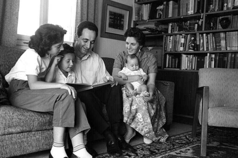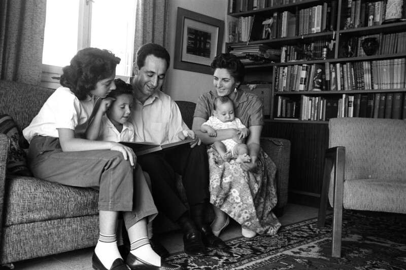 "תמיד אהבתי את הילדים, ללא שום העמדת פנים". פרס עם אשתו סוניה ושלושת ילדיהם: צביה, יוני והתינוק נחמיה (חמי) , 1958