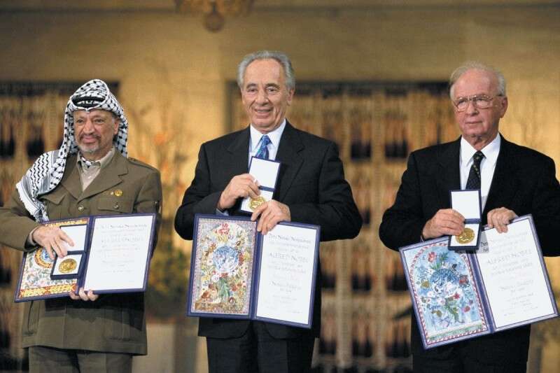 הביע תקווה שבסופו של דבר, ייכון שלום בין ישראל לבין הפלשתינים. שלושת חתני פרס נובל לשלום לשנת 1994, באוסלו שבנורבגיה. מימין לשמאל: ראש הממשלה יצחק רבין, שר החוץ שמעון פרס ויו"ר אש"ף יאסר ערפאת