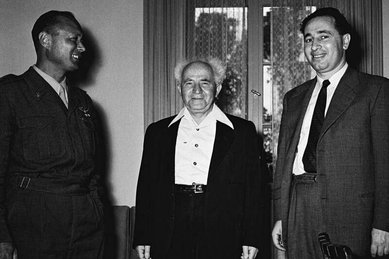 "בן־גוריון היה סוג של אבא עבורי". מימין לשמאל: סגן שר הביטחון פרס, שר הביטחון בן־גוריון והרמטכ"ל דיין בקריה בת"א, שנות ה־50