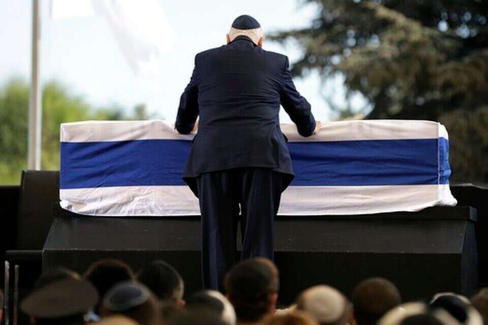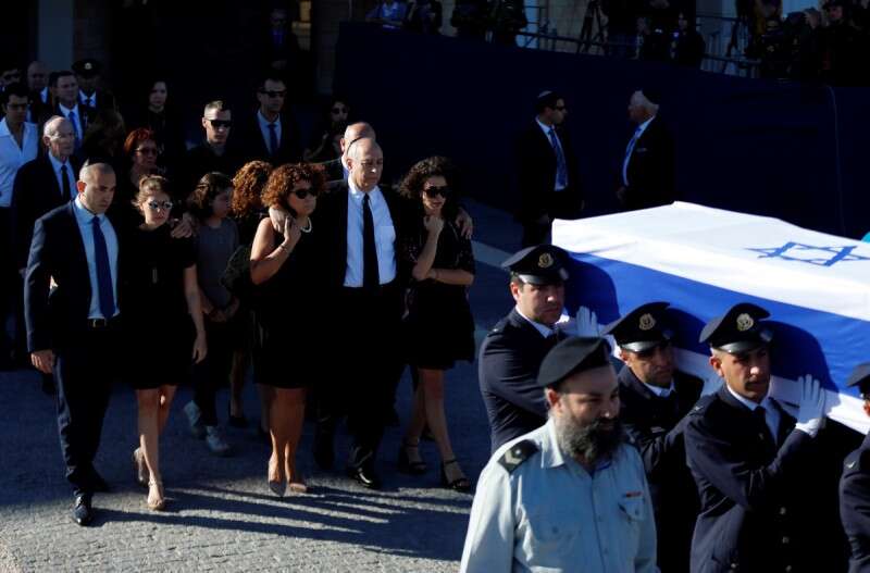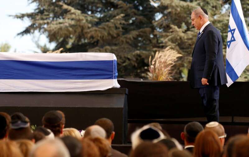 רה"מ נתניהו עובר על פני ארונו של פרס בהר הרצל // צילום: רויטרס