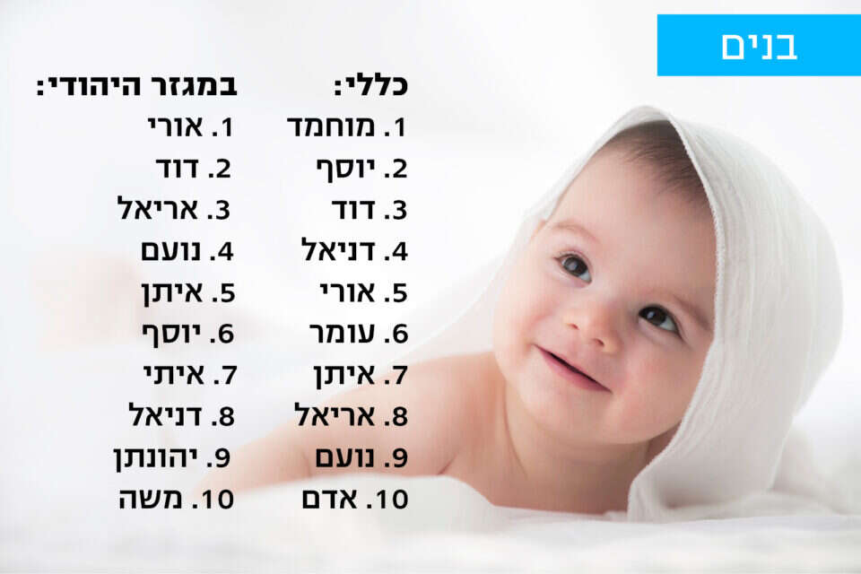 בעבור בנים, בקרב המגזרים היהודי והערבי עשרת השמות הנפוצים ביותר בסדר יורד הם: מוחמד, יוסף, דוד, דניאל, אורי, עומר, איתן, אריאל, נועם ואדם. במגזר היהודי השמות הנפוצים ביותר השנה היו: אורי, דוד, אריאל, נועם, איתן, יוסף, איתי, דניאל, יהונתן ומשה.