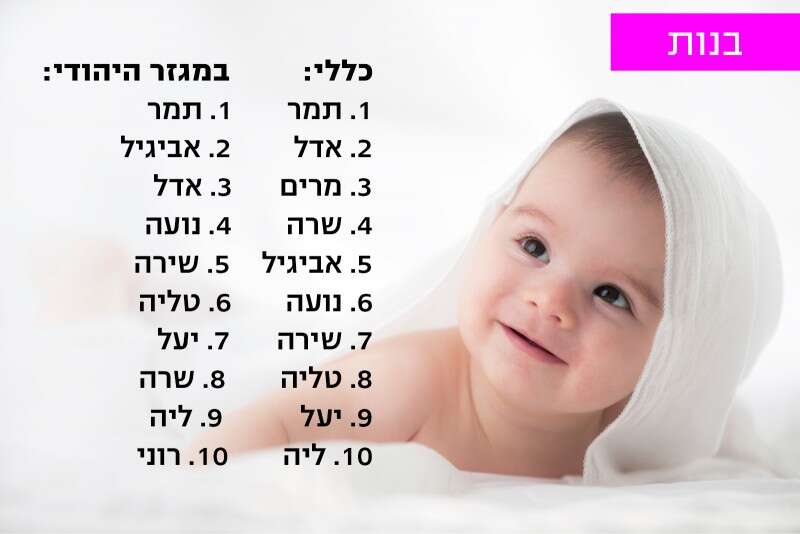 בקרב הבנות השמות הנפוצים ביותר בעבור המגזר הכללי בסדר יורד הם: תמר, אדל, מרים, שרה, אביגיל, נועה, שירה, טליה, יעל וליה. בקרב המגזר היהודי, השמות הנפוצים עבור בנות בסדר יורד הם: תמר, אביגיל, אדל, נועה, שירה, טליה, יעל, שרה, ליה ורוני.