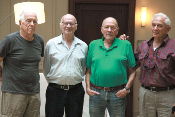 המחלצים והמחולצים יחד. מימין לשמאל, שורה עליונה: הטייסים יצחק זוסמן (זמיר), דן הדני, שלמה ברשצקי, לוינסון משה ארנרייך, אלברט עטר וחנוך קרת (קרטר); מימין לשמאל, שורה תחתונה (יושבים): הסיירים דב (דובן) שמחוני, אהרון לברן, יורם ליפסקי, אשר לוי, עמנואל (מנו) שקד ויגאל תלמי; על הקומנדקר: הרמטכ"ל משה דיין