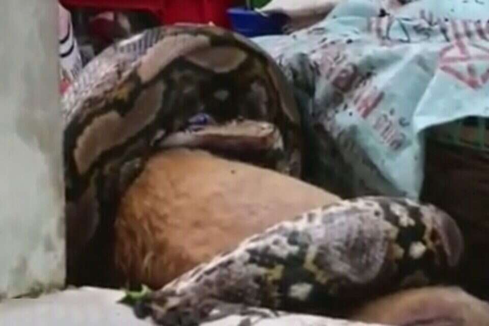 בעלת כלב מתאילנד לא חלמה כי כשהיא התעוררה היא תמצא את הראש של חיית המחמד האהובה שלה נמצאת במלתעותיו של נחש פיתון ענק.