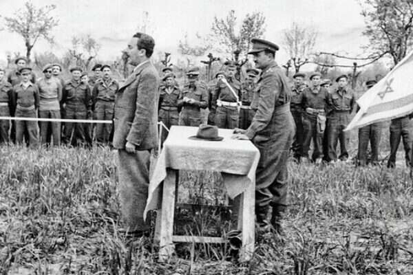 משה שרת - מי שיהיה לימים ראש ממשלת ישראל - פעל רבות במסגרת "ההגנה" להקמת הבריגדה היהודית ולקידום ההעפלה. רבים הדביקו לו את הכינוי "שר החוץ של העקורים" בשל עשייתו הרבה בעבורם בטרם קום המדינה. בתמונה: שרת (בקידמת השולחן) ב"נאום הדגל", נושא דברים על סמליות שחרור אירופה בידי לוחמים יהודים בעת טקס הנפת דגל החי"ל במטה הראשי בבריזיגלה. (צילום: א' ברוקמן באדיבות יורם שרת, העמותה למורשת משה שרת, תל אביב)