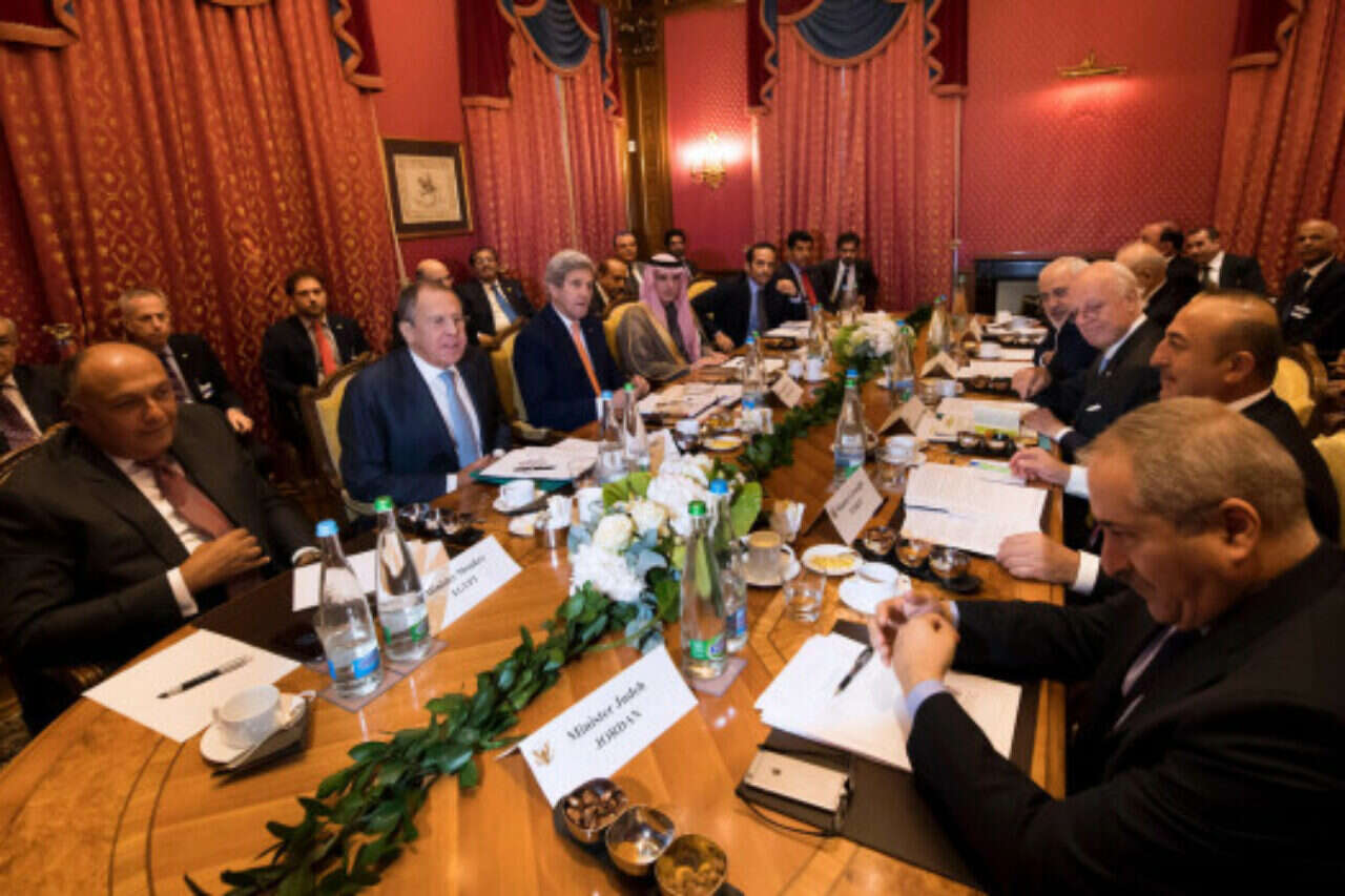 הנוכחים בשיחות הם מזכיר המדינה של ארצות הברית ג'ון קרי, לברוב, שרי החוץ של ירדן, טורקיה, מצרים, קטאר, איראן, עיראק וערב הסעודית.