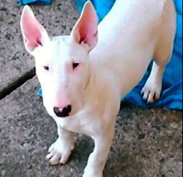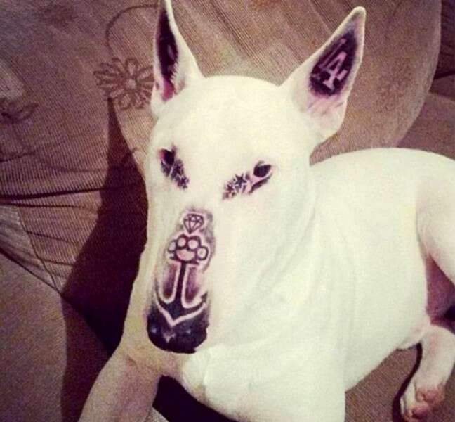 לכלבה מזן בול טרייר יש קעקועים בצורה של עוגן, אגרופן ויהלום על האף.