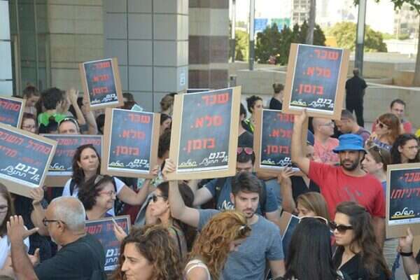 בהפגנה שהתקיימה שלשום המורים נשאו שלטים, שעליהם נכתב, בין השאר, "שכר מלא בזמן", "מחדל השכר - לא שגגה, כי אם מדיניות", וקראו "לא, לא, זה לא טעות - המחדל זו מדיניות".