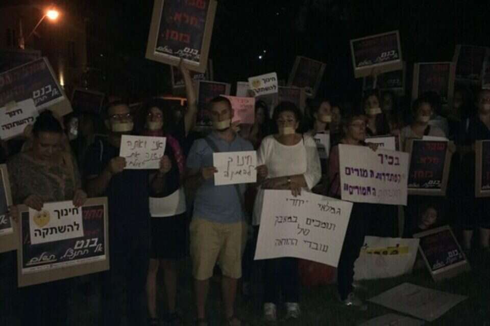 המורים מחריפים את דרישותיהם: מאות מורים הפגינו הערב (שלישי) מחוץ לביתו של שר החינוך נפתלי בנט- זאת במחאה על הלנה בשכרם וקיזוזים שנעשו בו בשל קליטה לקויה של עובדים במערכת של משרד החינוך. המורים הפגינו עם פלסטר על הפה, ובדממה - ללא הגברה כיוון שטענו שהמשטרה מנסה להשתיק אותם ולא אפשרה להם לעשות שימוש בהגברה.