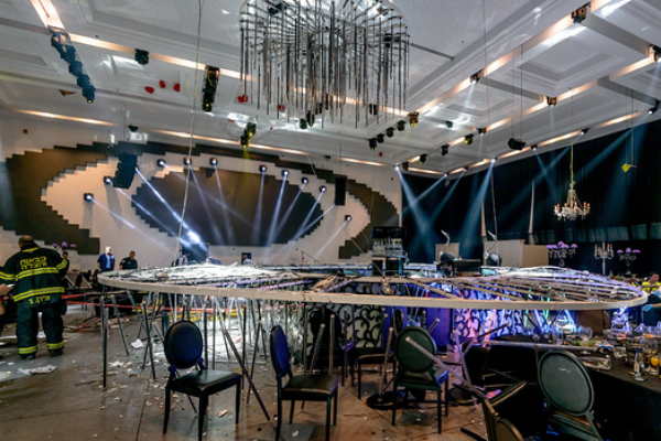 לשם התקנת גוף התאורה בתקרת האולם גייס זרוג את ברנס, אותו הנחה באיזה אופן עליו לתלות את גופי התאורה, מבלי להיוועץ עם איש מקצוע. גוף התאורה הותקן כאשר הוא לוקה בכשלים רבים, ובעוד לכל אחד מעשרות גופי התאורה הקטנים שהותקנו בתקרת האולם על ידי חברת התאורה חובר כבל אבטחה, דווקא לגוף התאורה המרכזי לא דאגו זרוג או ברנס לחבר מנגנון אבטחה למניעת צניחת גוף התאורה במקרה של כשל. בתאריך 27.8.14 נפתח האולם והחלו להתקיים בו אירועים באופן תדיר ובנוכחות אנשים רבים. זאת, בעוד שהנאשמים ידעו שגוף התאורה לא תוכנן ונבנה על ידי מי שהינו בעל הכשרה מתאימה לכך, ואף לא נבדק ולא אושר על ידי מהנדס מכונות מוסמך. הנאשמים אף לא דאגו לקיומם של אמצעי בטיחות לגוף התאורה.