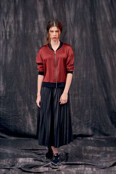 פרופיל ז'קט בומבר בורדו שחור 279 ש"ח חצאית פליסה שחורה מבריקה 279 ש"ח // צילום: שי קדם