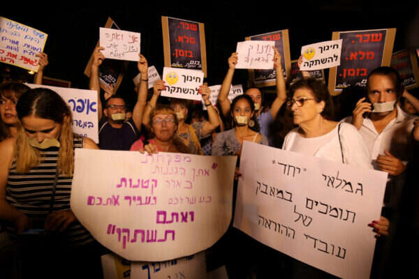 אתמול נערכה הפגנה מחוץ לביתו של שר החינוך נפתלי בנט ברעננה, אליה הגיעו מאות מורים ועובדי משרד החינוך שמחו עם דבק על פיותיהם בטענה שמשטרת ישראל לא אישרה להם להביא הגברה להפגנה.
