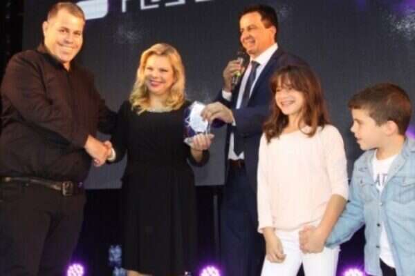 Prime Minister Benjamin Netanyahu's wife, Sara Netanyahu, presents Israel Hayom's northern affairs and Arab affairs reporter Daniel Siryoti with Defender of Social Justice award for his contribution to Holocaust survivors and the needy in Israel.