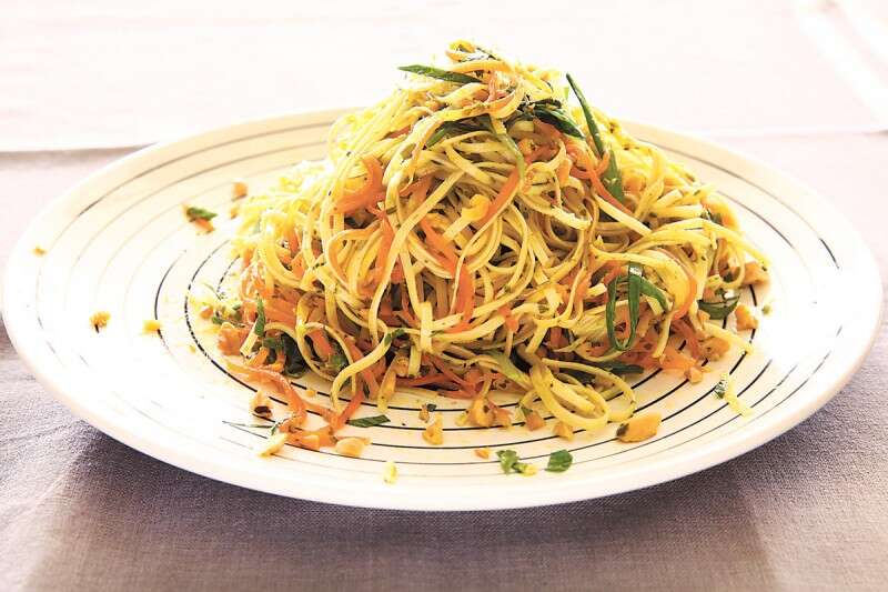 אטריות אורז עם אטריות גזר מאודה, פסטו פטרוזיליה ושקדים // צילום: לירון אלמוג