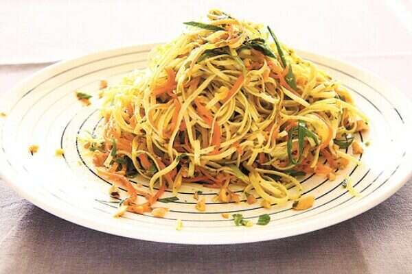 אטריות אורז עם אטריות גזר מאודה, פסטו פטרוזיליה ושקדים // צילום: לירון אלמוג