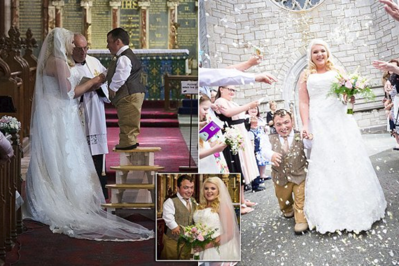 חתונה על הגובה: ג'יימס לסטד (28) נאלץ להביא סולם עץ בשביל להסתכל על אשתו הטרייה בגובה העיניים כשהוא אומר לה "I do", ומנשק אותה מול המשפחות והחברים שהתכנסו לכבודם בכנסייה המקומית בעיירה בודלוויידן שבצפון וויילס. לסטד, שגובהו 1.12 מ', נישא לקלואי (22) - מורה שגובהה 1.73 מ'.