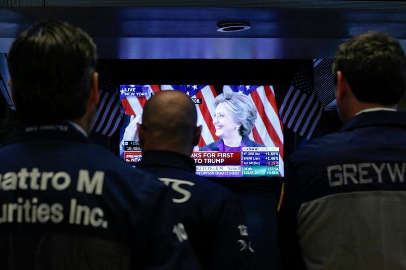 סוחרים בבורסה בניו יורק צופים בנאום ההפסד של קלינטון // צילום: רויטרס