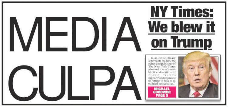 לאור ניצחונו של דונלד טראמפ בבחירות החלו כלי תקשורת מרכזיים בארה"ב בחשבון נפש, בעוד שאחרים מסרבים להכיר בטעותם. ההכאה על חטא ניכרת במיוחד ב"ניו יורק טיימס", שהודה כי התנהלותו לאורך הקמפיין היתה מוטית לטובת הדמוקרטים, גם אם "לא מתוך כוונה להוליך שולל".