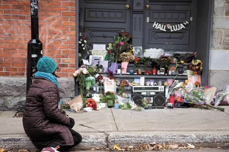 פרחים וחפצים שהניחו מעריצים בפתח ביתו של כהן במונטריאול // צילום: רויטרס