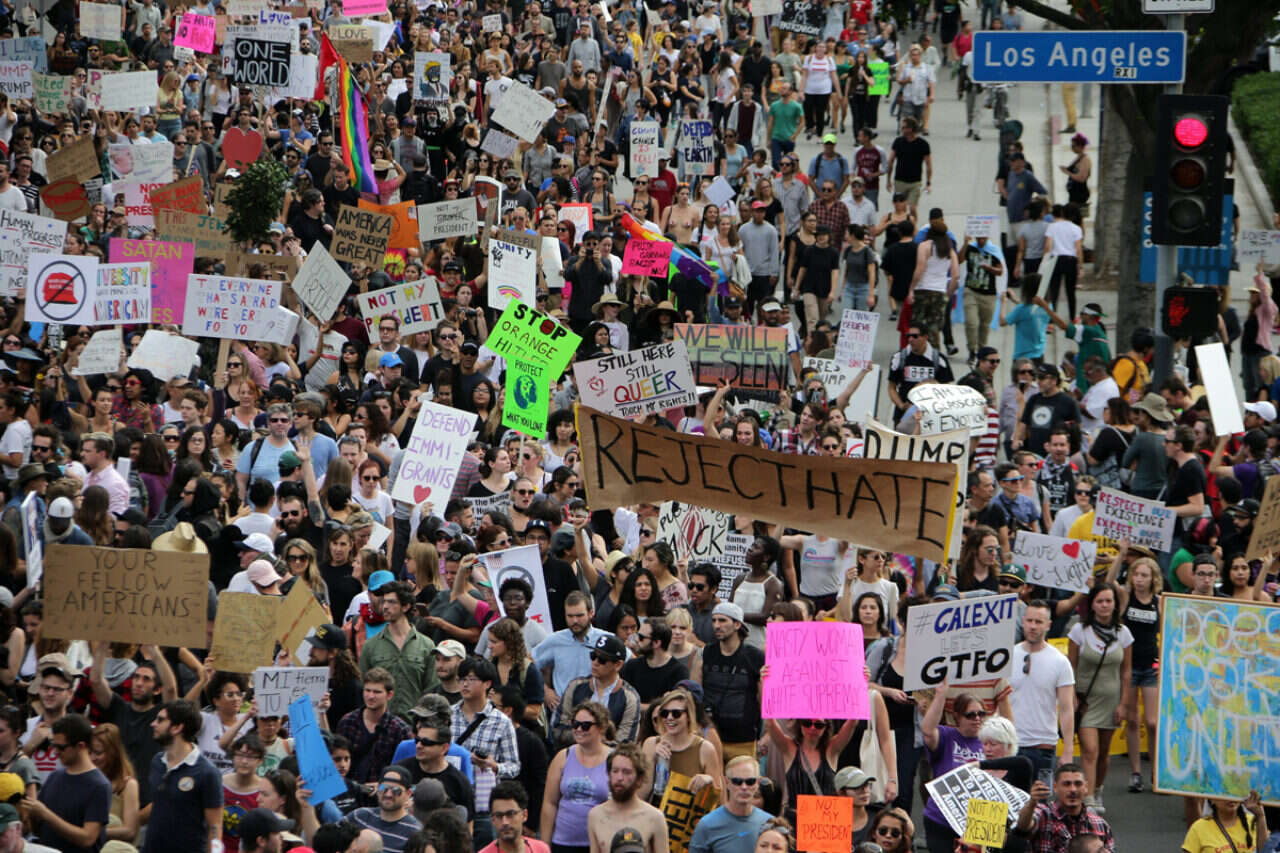 בינתיים, ההפגנות נכנסו ליומן הרביעי. הגדולות שבהן נרשמו בלוס אנג'לס, בניו יורק ובשיקגו, כאשר רוב המוחים שומרים על הסדר הציבורי. בניו יורק התכנסו אלפי מפגינים ביוניון סקוור שבמנהטן, לפני שהחלו לצעוד במעלה השדרה החמישית. המחאה הגיעה לשיאה עת התהלוכה עשתה את דרכה אל מגדלי טראמפ, שם מתגורר הנשיא הנבחר ושם באותו הזמן ישבו הוא ואנשי צוותו ותיכננו את הכניסה לבית הלבן. המשטרה מנעה מהמפגינים להתקרב אל המגדל, אך אלו עמדו בחוץ ושאגו, בין השאר, "אנחנו דוחים את הנשיא הנבחר". במפגינים היה גם במאי הקולנוע הליברלי מייקל מור, שדרש מטראמפ לוותר על תפקיד הנשיא.