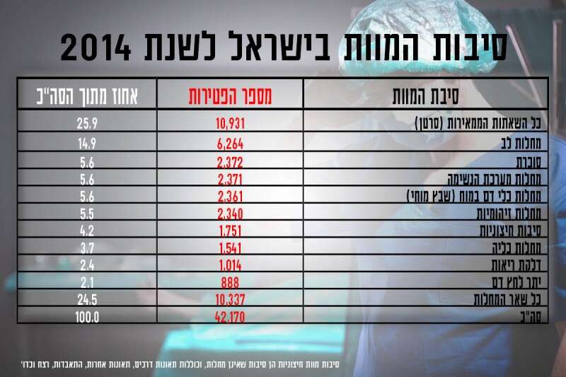 סיבת המוות השכיחה ביותר בישראל היא סרטן ולאחריה – מחלות לב. כך עולה מנתונים שהפיצה הלשכה המרכזית לסטטיסטיקה לגבי שנת 2014. בנתונים יש מגמה מעודדת שכן הם מלמדים כי שיעורי התמותה ממחלות לב וממחלות כלי דם במוח ירדו ביותר מ-80% מאמצע שנות ה-70. כמו כן, שיעורי התמותה ממחלת הסרטן, ממחלת לב איסכמית וממחלות כלי דם במוח בישראל נמוכים יחסית למרבית מדינות ה-OECD.