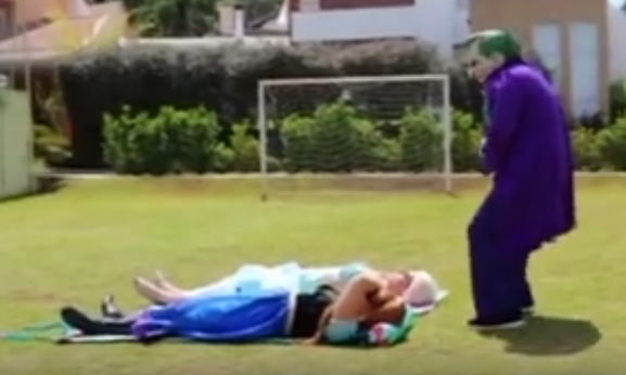 הג'וקר מטיל את מימיו על שתי נערות בבגדי ים // צילום מסך