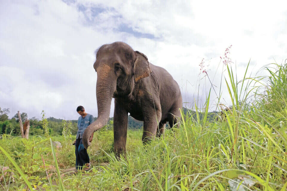 תום לוקחת את חמשת פיליה - שגובהם הממוצע יותר משני מטרים וחצי ומשקלם שלוש טונות ויותר - ומובילה אותנו לסיור בטבע שעוטף את המחנה. בצעדה איטית על שביל אדמה מאולתר, בין עצים וצמחים ירוקים, מתקדמים הפילים, כשהם סוטים מדי פעם מהדרך לשאוב בחדק עשבים למאכל.