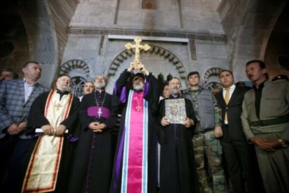 The bells have rung out after two years of silence in the Mar Korkeis church in the town of Bashiqa, some 10 miles north of Mosul, Islamic State's last major city stronghold in Iraq. Kurdish peshmerga fighters retook the town on Nov. 7, ending two years of rule by the terrorist group, which persecuted Christians and other minorities in the Nineveh plains, one of the world's oldest centers of Christianity. Women trilled to celebrate the moment when a new crucifix was again installed on the church, replacing one that was broken by the Islamic State operatives. The town is largely empty as the peshmerga have not finished clearing explosives and mines left behind by the insurgents in their fight against U.S.-backed Iraqi and Kurdish forces who launched an offensive on Mosul on Oct. 17. "We want people to be patient and not to return here until we completely clear the area, as we want to ensure their safety," said peshmerga Brig. Gen. Mahram Yasin. After seizing the Nineveh plains in 2014, Islamic State issued an ultimatum to Christians: pay a tax, convert to Islam, or die by the sword. Most abandoned their homes and fled to the nearby autonomous Kurdish region. The priest at the Mar Korkeis church, Father Afram, said he would prefer Bashiqa to remain under the control of the Kurdistan Regional Government and not revert to the Iraqi central government in Baghdad, about 250 miles to the south. "Of course we would prefer to be part of the KRG, because of our proximity to the area and because, for the past 13 years, the regional government has been looking after us," he said. "Nobody from Baghdad came here to say hello, at all," since the U.S.-led invasion that toppled Iraqi leader Saddam Hussein, he said. Christianity in northern Iraq dates back to the first century C.E. The number of Christians has fallen sharply during the violence which followed the 2003 toppling of Hussein, and Islamic State's takeover of Mosul two years ago saw the city purged of Christians for the first time in two millennia. From a Mosul mosque in 2014 Islamic State leader Abu Bakr al-Baghdadi declared a "caliphate" spanning parts of Iraq and Syria. The recapture of Mosul would mark the effective defeat of the group in Iraq.
