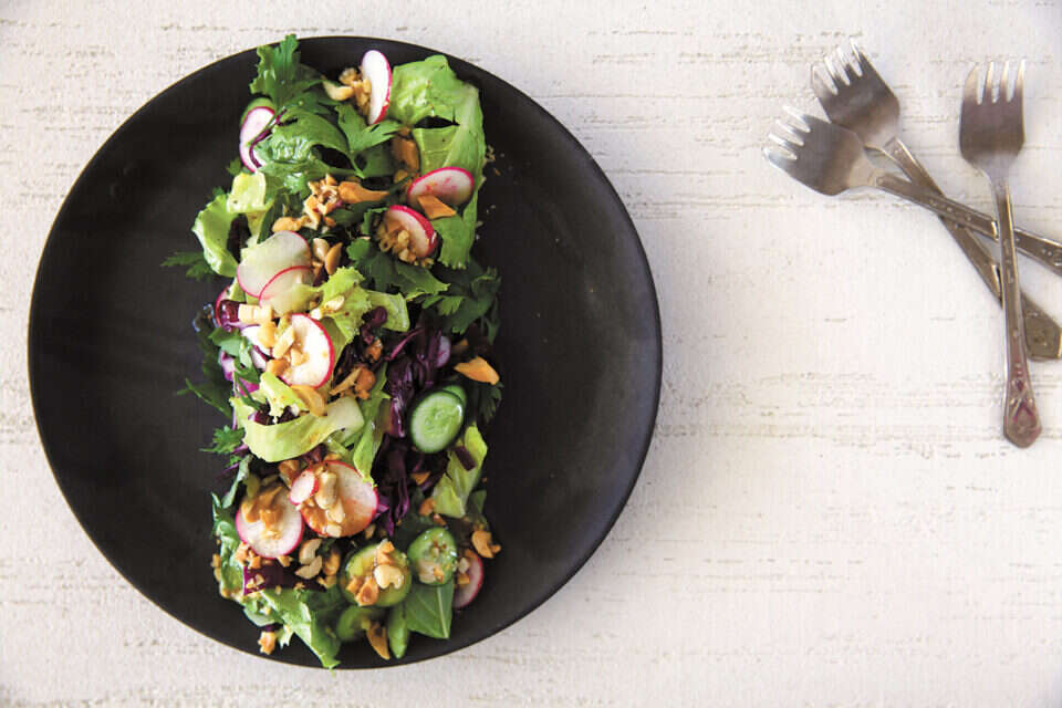 סלט ירקות פריכים עם שבבי בוטנים ושמן בוטנים