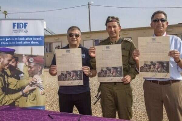 A delegation of some 70 members of the Friends of the Israel Defense Forces, currently in Israel, met with soldiers and officers from the IDF's Kfir Brigade on Yiftah Base in southern Israel last week. A moving ceremony marked the brigade's formal "adoption" by the FIDF, which was made possible thanks to a donation by Dr. Miriam and Sheldon Adelson. The donors take care of the lone soldiers serving in the brigade and members of the brigade whose families struggle financially, and provide weeks of rest and relaxation and other activities for the soldiers' benefit. Dr. Miriam and Sheldon Adelson were the guests of honor at the FIDF's annual gala, held in New York this past March. In addition to adopting the Kfir Brigade, the Adelsons have also adopted the Golani and Givati infantry brigades, and have lent their support to other programs and projects that the FIDF organizes for IDF troops. Dr. Miriam and Sheldon Adelson own the company that is the primary shareholder of Israel Hayom.