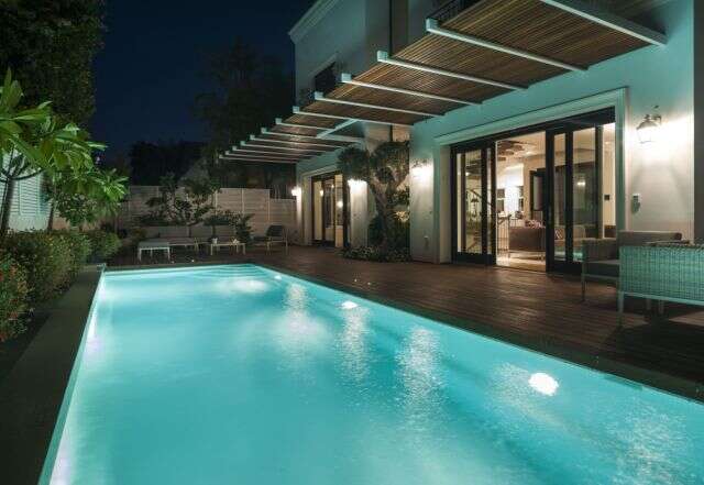 החצר: קיימת בריכת שכשוך עם פסיפס לבן שמקבל את הצבע הכחול הטבעי של השמיים, ונותנת תחושת הגדלה לבריכה.