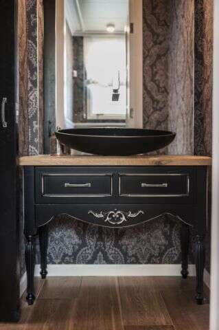הסלון: מתקבלת אווירה אירופאית באמצעות קמין גז משולב, שהוזמן בעבודת נגרות ידנית מיוחדת בצבע שחור מאד דומיננטי בסגנון צרפתי.
