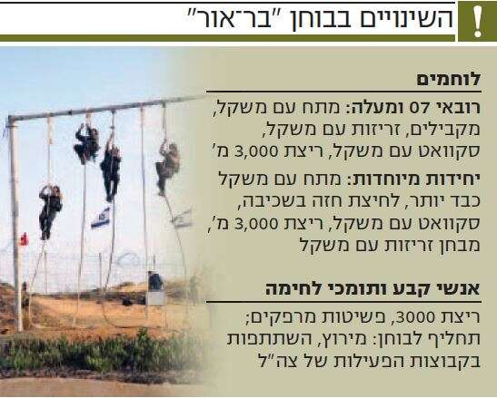 כעת הצבא שוב משנה את בוחן הכשירות הגופנית ללוחמים. בתחילה, יחול השינוי רק על לוחמים שכשירותם היא רובאי 07 ומעלה. על פי ההחלטה החדשה, כלל לוחמי החי"ר וגדודי הסיור בצבא יידרשו לבצע מבחן עליות מתח ובוחן זריזות עם אפוד קרבי, מימיות ומחסניות - ובסך הכל כ־7 ק"ג. כמו כן, יידרשו לבוחן מקבילים ללא אפודים ולביצוע סקוואטים עם שק חול השוקל כ־20 ק"ג. כל זאת נוסף על ריצה של 3,000 מטרים.