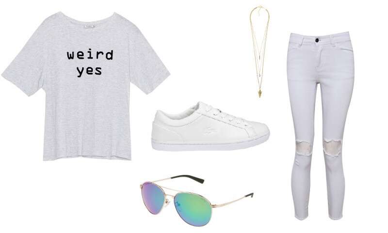 מכנסי ג'ינס לבנים TNT 209 ש"ח // צילום: אלעד חיזקי. טישרט עם כיתוב פול אנד בר 49.90 ש"ח // צילום: יח"צ חו"ל סניקרס לבנות לקוסט לשוסטר 549 ש"ח // צילום: יח"צ. משקפי שמש פוליס 1100 ש"ח // צילום: יח"צ שרשרת forever young //צילום: גיא פרנקו