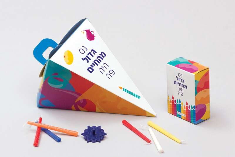 המחיר: 18 ש' למארז חטיפים, ממתקים, סביבון ו־44 נרות חנוכה צבעוניים, להשיג באתר gdolim.org.il/shop