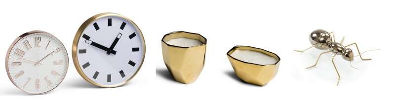 מימן לשמאל: נמלה HOUSE IN MODA // צילום: יח"צ חו"ל, מחזיקי נרות ושעונים של גולף אנד קו // צילום: אודי דגן