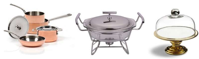 גם למטבח. מימין לשמאל: מעמד לעוגה, גולף אנד קו // צילום: יונתן בלום, כלי הגשה למרק הרמוניה לבית // צילום: אסף לוי, מערכת סירי נחושת ארקוסטיל קיטצ'ן // צילום: אפרת אשל